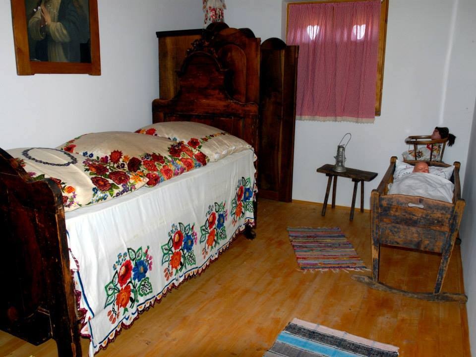 U središtu prostorije nalazi se za današnje pojmove prilično uzak krevet, s madracem i jastucima punjenima guščjim perjem ili slamom, ukrašen ručno izrađenom posteljinom. Pokraj kreveta stoji drvena škrinja – ukrašeni sanduk s poklopcem koji je služio kao ormar za rublje, odjeću, posteljinu i vrijedne dokumente.
